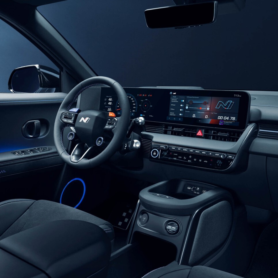 아이오닉 5N의 실내입니다. 가장 눈에 띄는 것은 새로운 'N'핸들입니다. 기존의 E-GMP 차량들의 스티어링 휠 디자인과 다다릅니다. 3 스포크의 스티어링 휠에 N모델을 위한 여러 가지 추가 버튼들이 들어갔습니다.