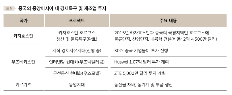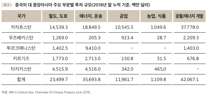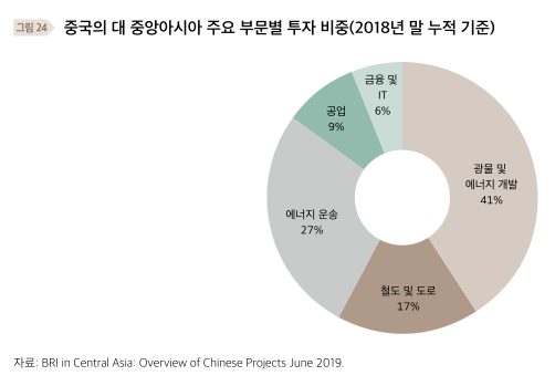 중국의 대 중앙아시아 투자는 부문별로는 광물 및 에너지 자원 개발 부문에 대한 투자액이 가장 많으며,