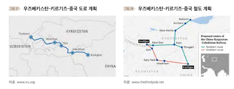 -(철도) 중국과 키르기즈, 우즈베키스탄을 연결하는 철도 건설, 중국의 호르고스에서 카자흐스탄 카스피해 항만인 악타우 간의 철도 건설 등이 계획됩니다.