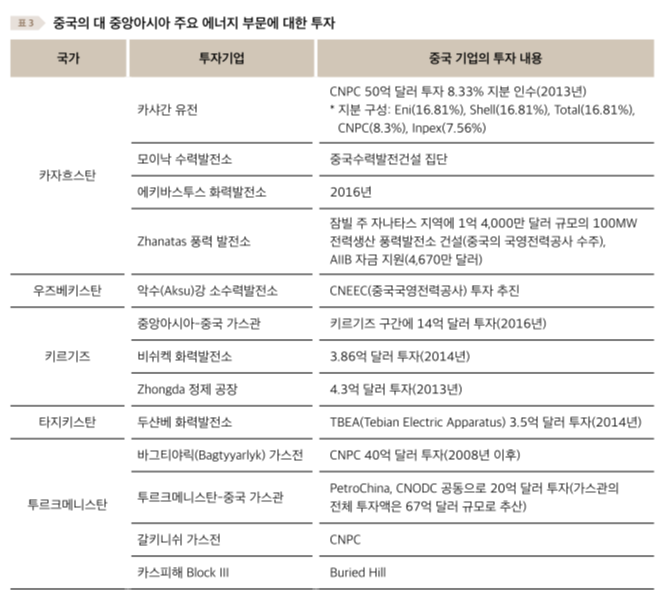 -(유전) 카자흐스탄의 텡기즈, 카라차가낙, 카샤 간 3대 유전에는 Chevron, Eni, Shell, Lukoil, Total 등 세계 주요 에너지 기업들이 투자하고 있으며, 중국의 CNPC는 중앙아시아 최대 유전인 카샤 간 유전에 8.3%의 지분을 투자하고 있습니다.