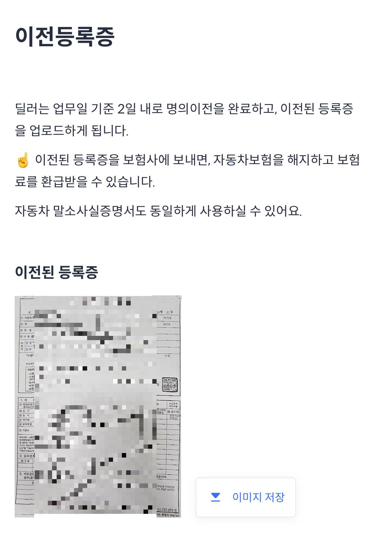차량을 보낸 후, 2일 내로 차량이전등록증을 받아 볼 수 있습니다.