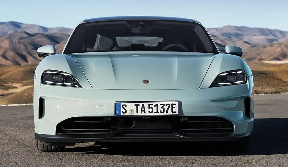포르쉐 타이칸 페이스리프트의 전면부입니다. 가장 눈에 띄는 부분은 헤드램프의 눈물샘이 사라졌다는 것입니다.