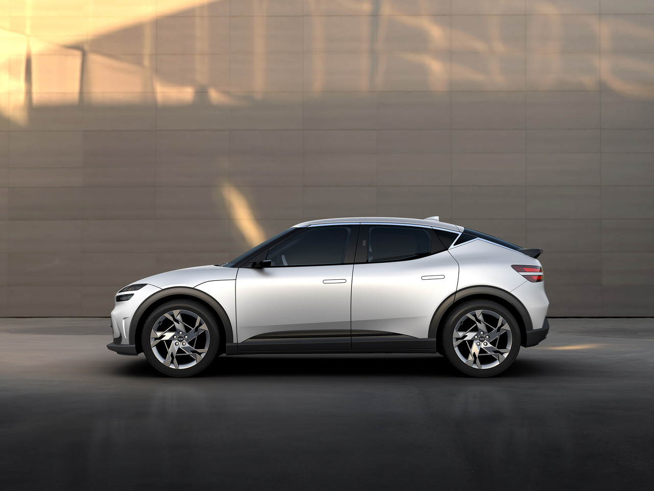 제네시스 GV60의 측면부입니다. 짧은 오버행과 긴 휠베이스로 고성능 전기차의 면모를 보여주고 있습니다.