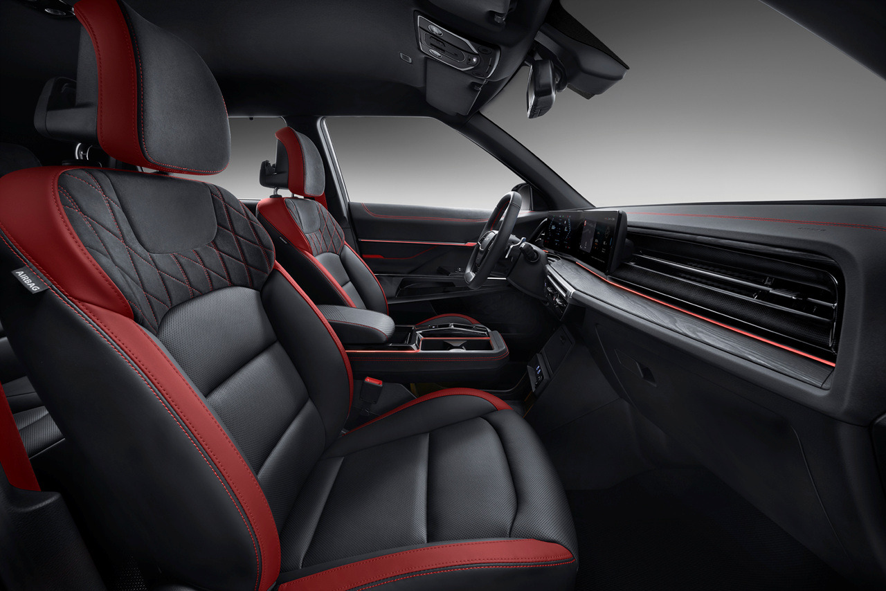 D컷 스티어링휠과 물리 버튼의 조화는 고성능 차량을 연상캐하며, 퀼링 패턴 시트와