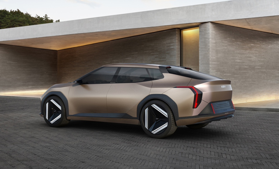 EV4는 기아의 미래 지향적인 전동화 비전을 보여주는 모델로, 독창적인 로프 스포일러와 수직형 테일램프를 통해